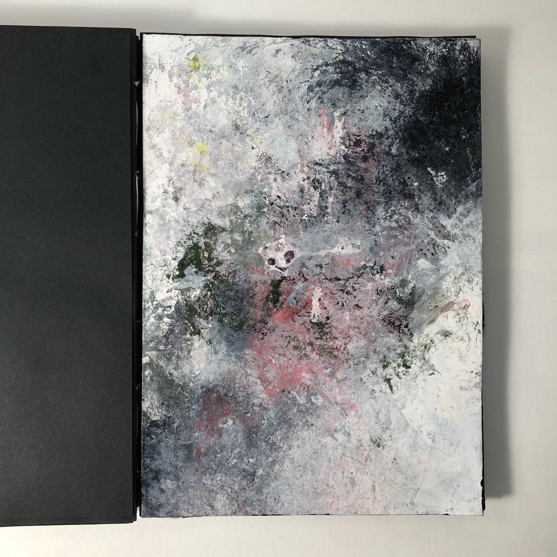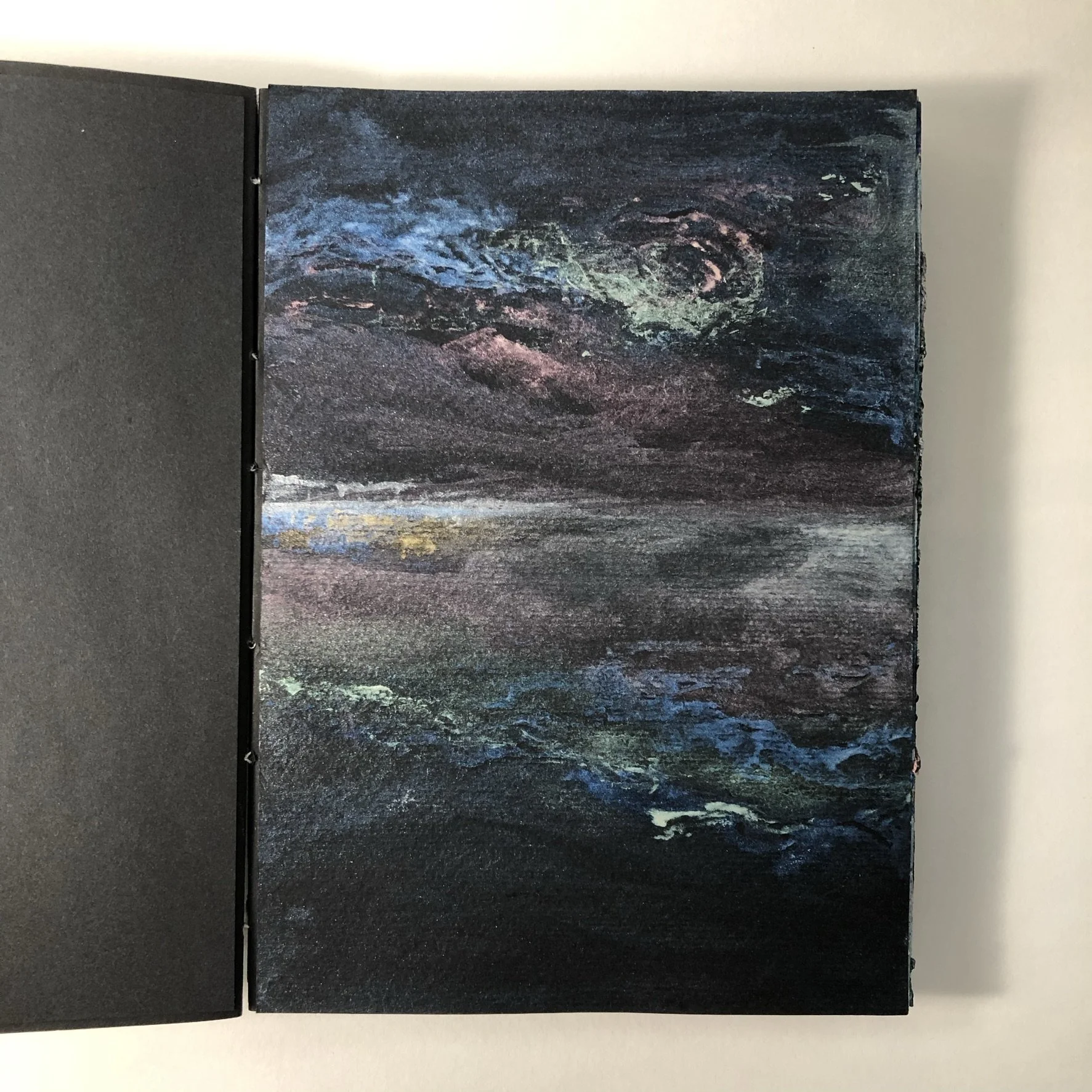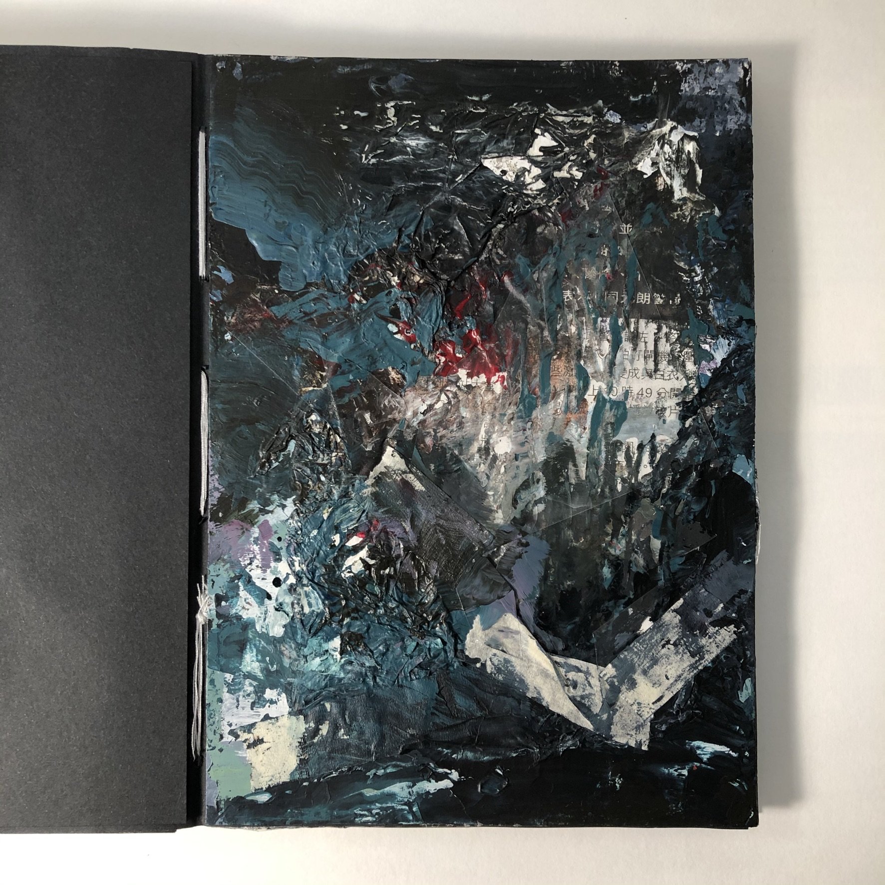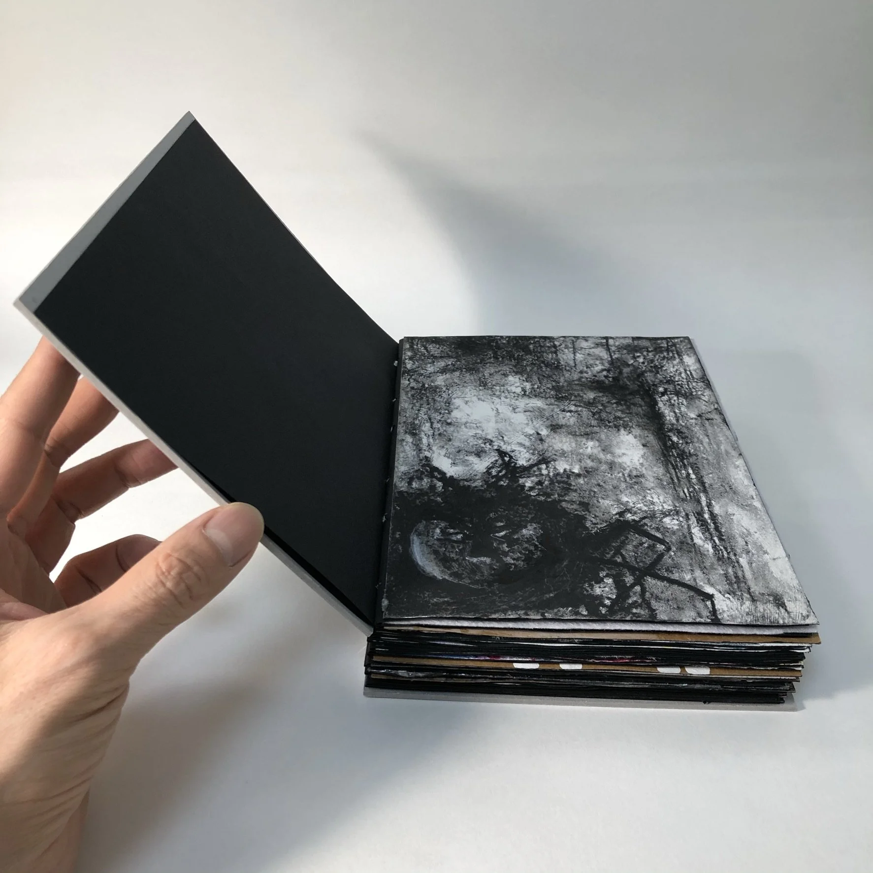 This handcraft book with kettle stitch binding is a collection of 31 paintings in memoir of the artist’s emotional journey looking after his beloved who sufferred from manic depression. Dark, hallucinatory, hysteric.